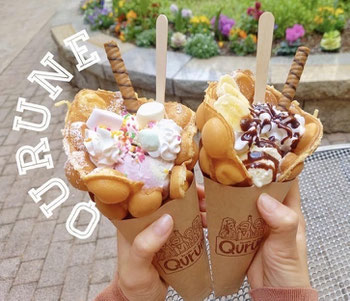 防府市を中心に出店しているQuruneといいます。山口県でも珍しいエッグワッフルやライスバーガーを販売しています。エッグワッフルは生地がもっちりしていてアイスやクリームとの相性は抜群です。種類も14種類ありますので、ぜひ1度ご賞味ください。