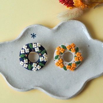 "極細レース糸で立体花を編み、ブローチやアクセサリーに仕立てています。一つ一つ丁寧に染色することで、花の繊細さを表現しています。
