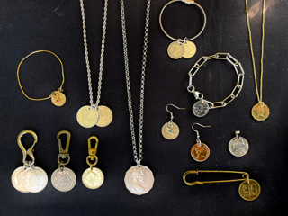 "コインメインのアクセサリーをその場でお作りいたします。生まれた年に製造された海外のコインや、幸せを呼ぶ6ペンスコインを使いネックレスやブレスレット、ピアス、キーホルダーなどお客様が作りたい物を選び、世界で1つのカスタムアクセサリーを完成させます。